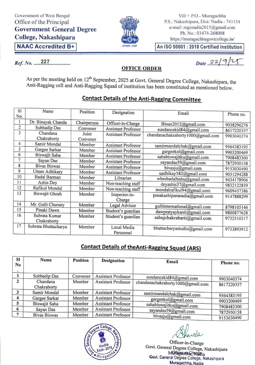 Per UGC and University of Kalyani rules, all students must submit filled anti-ragging declarations to their departmental faculty with personal and guardian email addresses; forms without these are incomplete.